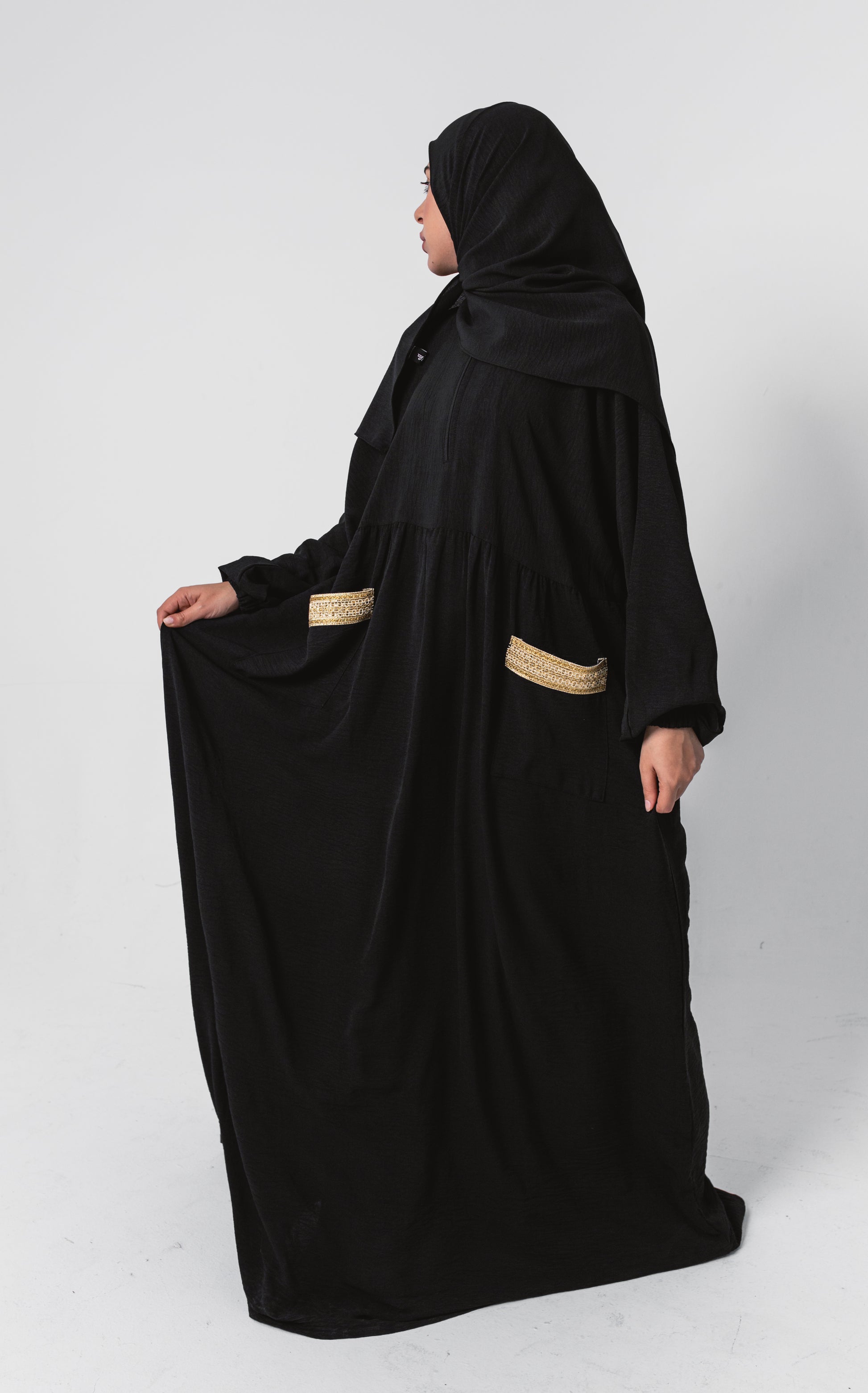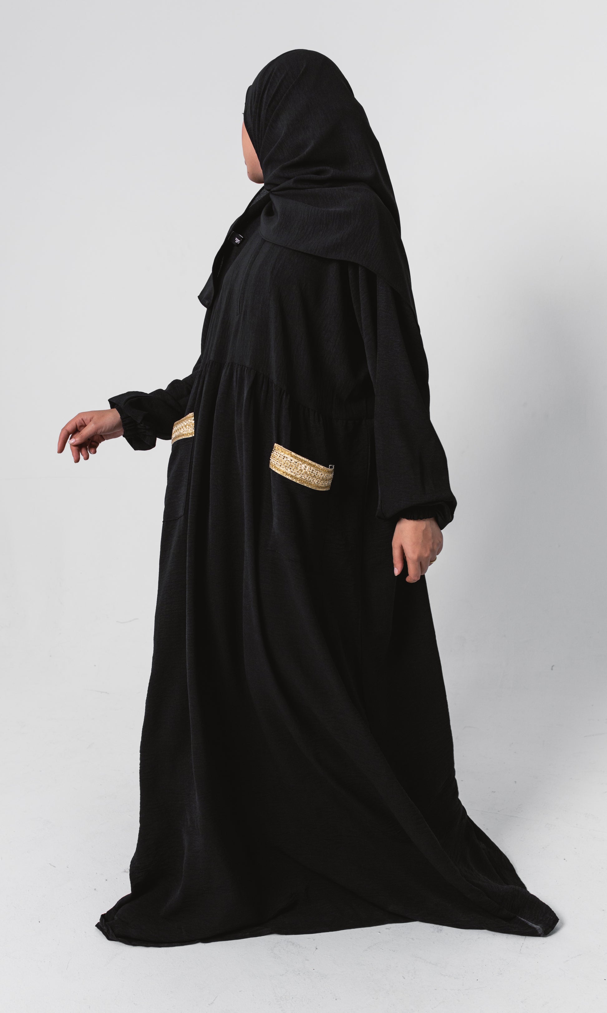 A comfortable black Ramadan isdal, featuring subtle gold embroidery on the pockets. Made from soft, premium fabric for a graceful drape, it combines modest elegance with practicality.